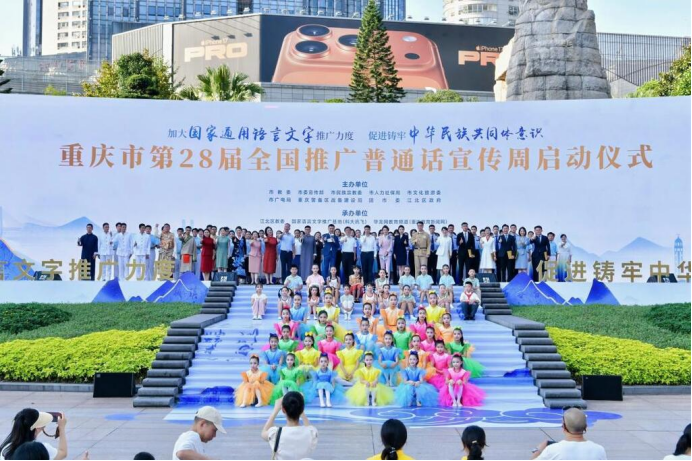 9月14日下午,重庆市第28届全国推广普通话宣传周活动在重庆市江北区商圈启动。自1998年起,每年9月第三周为全国推广普通话宣传周,本届活动以“加大国家通用语言文字推广力度,促进铸牢中华民族共同体意识”为主题。