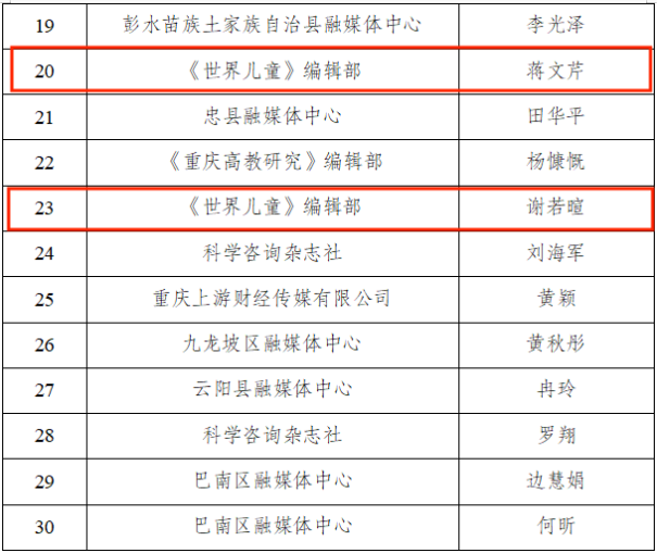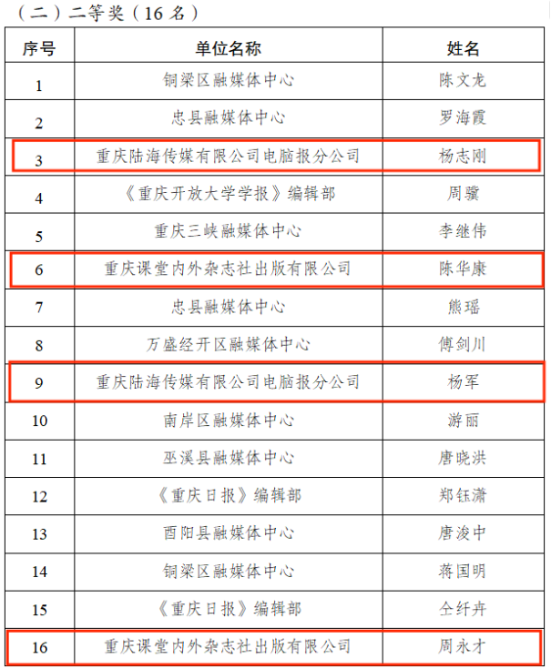 面对此次大赛,陆海传媒高度重视、精心组织,在团队和个人方面均派出颇具实力的员工参赛,最终经过激烈角逐,重庆陆海传媒有限公司电脑报分公司、重庆课堂内外杂志社出版有限公司、《今日教育》编辑部获得优秀组织奖,王雪欢、李彦博等2人获得一等奖,杨志刚、陈华康、杨军、周永才等4人获得二等奖,林安琪、杨力、粟国芮、蒋文芹、谢若暄等5人获得三等奖。