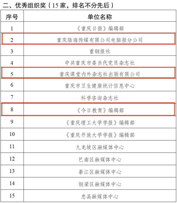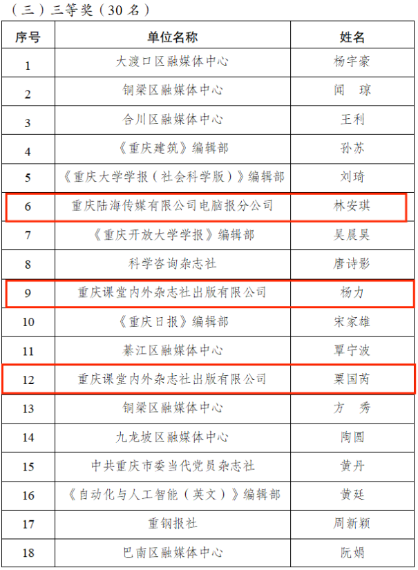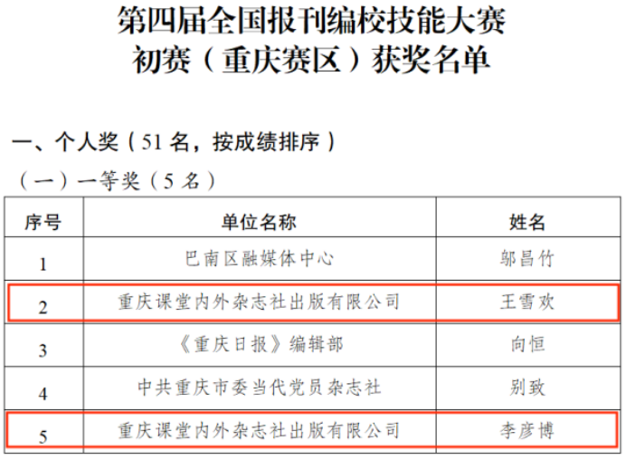 面对此次大赛,陆海传媒高度重视、精心组织,在团队和个人方面均派出颇具实力的员工参赛,最终经过激烈角逐,重庆陆海传媒有限公司电脑报分公司、重庆课堂内外杂志社出版有限公司、《今日教育》编辑部获得优秀组织奖,王雪欢、李彦博等2人获得一等奖,杨志刚、陈华康、杨军、周永才等4人获得二等奖,林安琪、杨力、粟国芮、蒋文芹、谢若暄等5人获得三等奖。